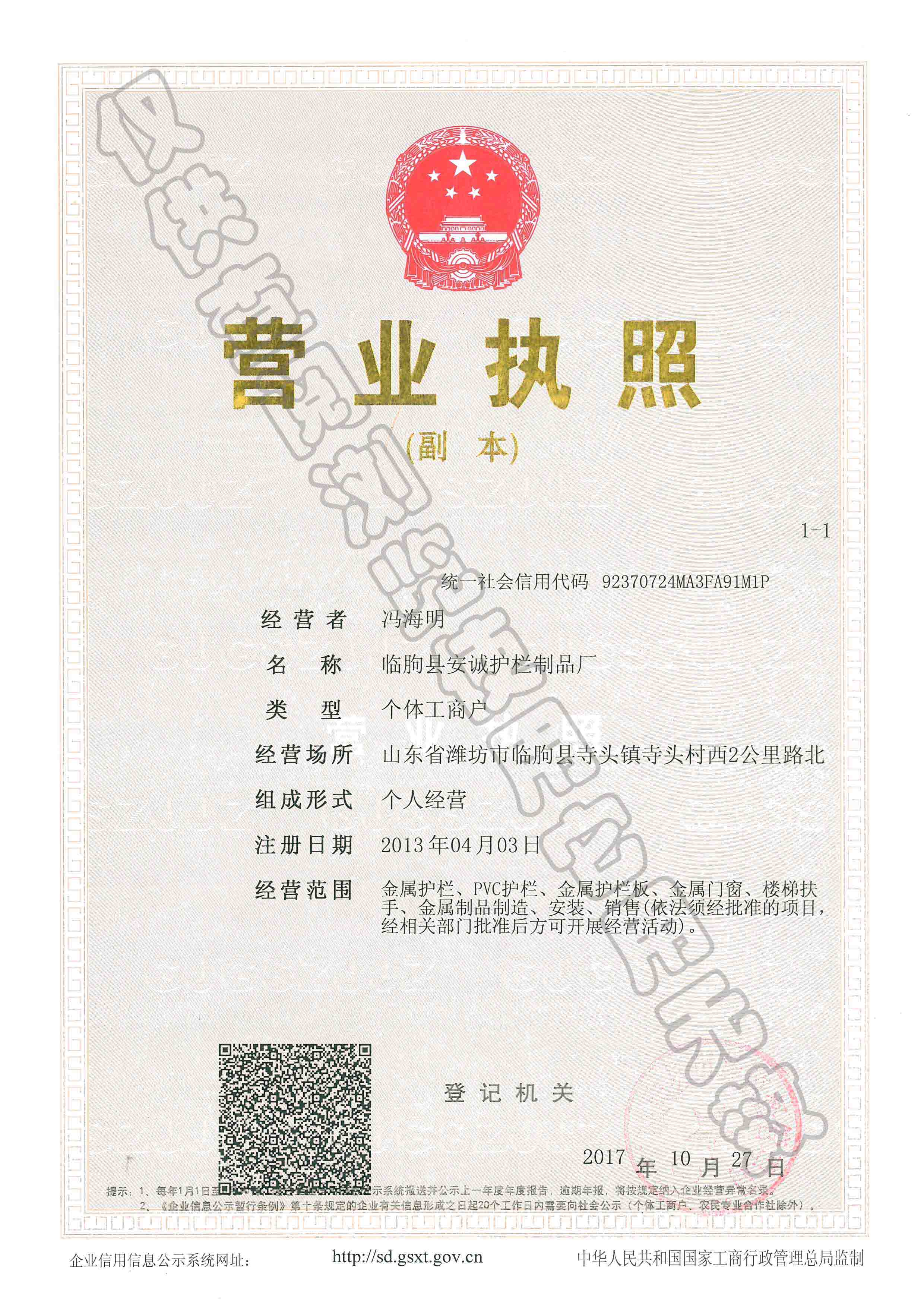 濰坊安誠(chéng)金屬制品有限公司下設(shè)臨朐安誠(chéng)護(hù)欄制品廠,廠址在臨朐呂匣新興工業(yè)園,廠房占地20畝, 多年以來,我們秉著“用心打造,用質(zhì)量說話”的理念,靠“熱情、創(chuàng)新、堅(jiān)持、 團(tuán)結(jié)”的企業(yè)精神,精益求精,以誠(chéng)為本打造行內(nèi)知名品牌。 因?yàn)檎\(chéng)信所以自信!讓客戶放心,省心,滿意是我們的目的。